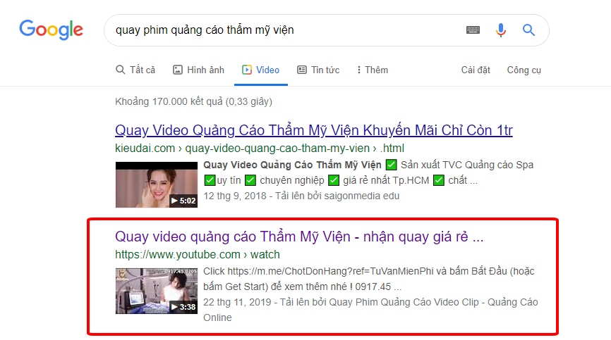 Khi search theo dạng video clip thì mẫu video quảng cáo của bạn cũng có khả năng hiển thị :